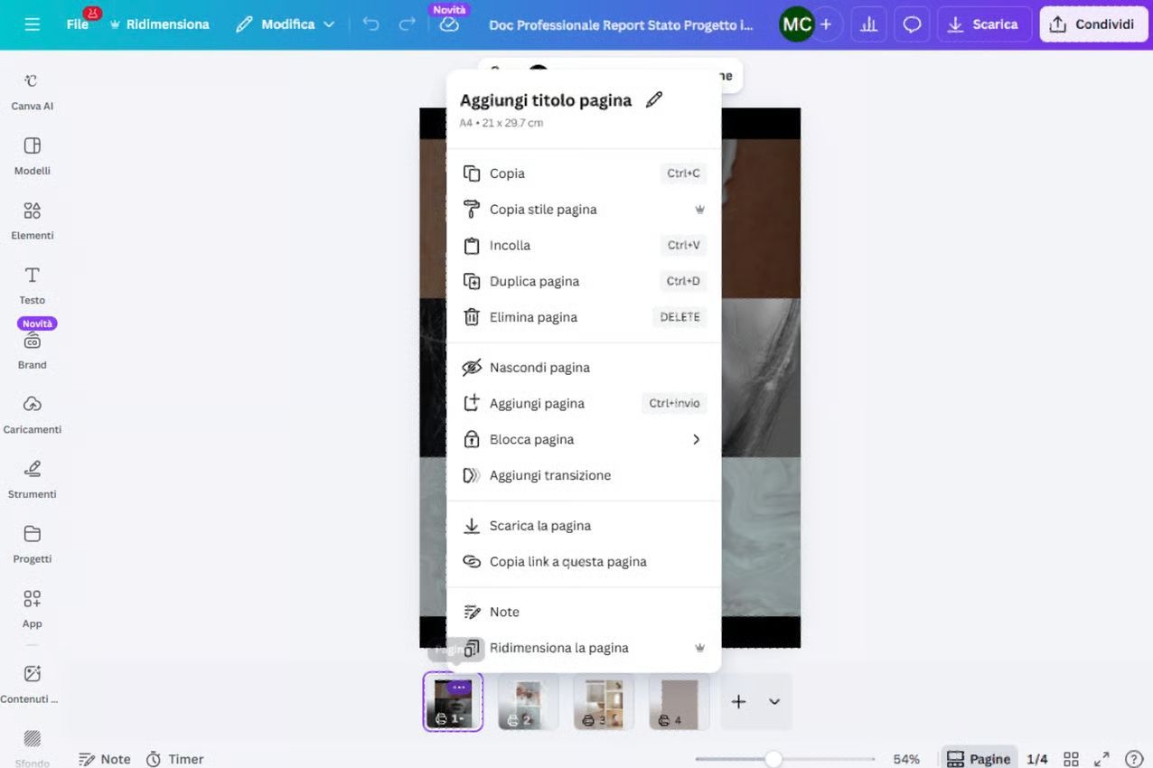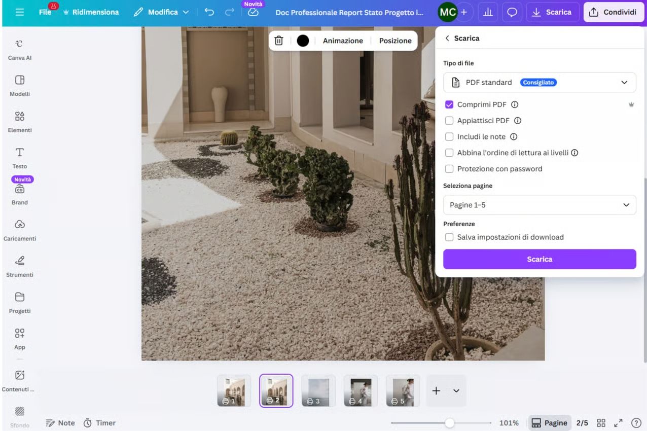 Canva permette di caricare le immagini, organizzarle e trasformarle in un documento pronto per l’invio o la stampa.